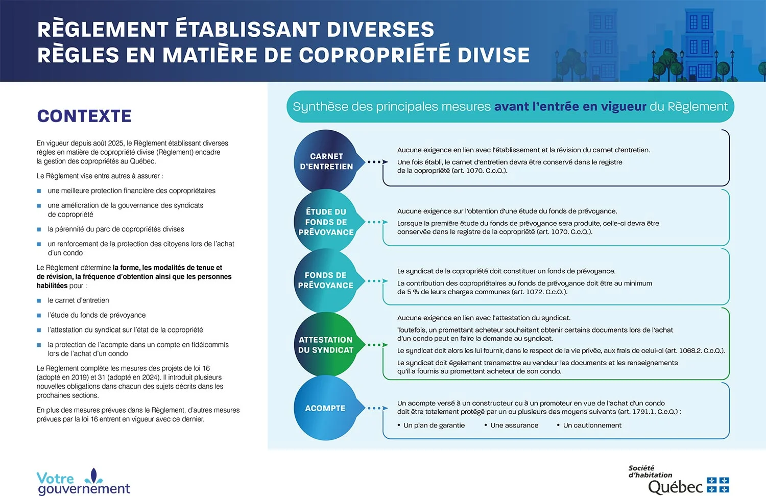 Selon le gouvernement québecois, depuis le 14 août 2025, la Loi 16 exige que toutes les copropriétés divises disposent :