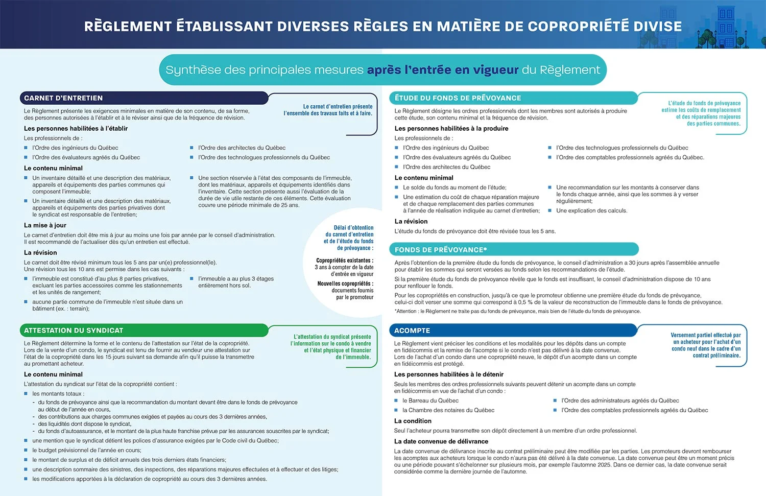 Ces exigences sont maintenant obligatoires pour tous les syndicats de copropriété. Pour les plus visuel, voici une synthèse des changements :